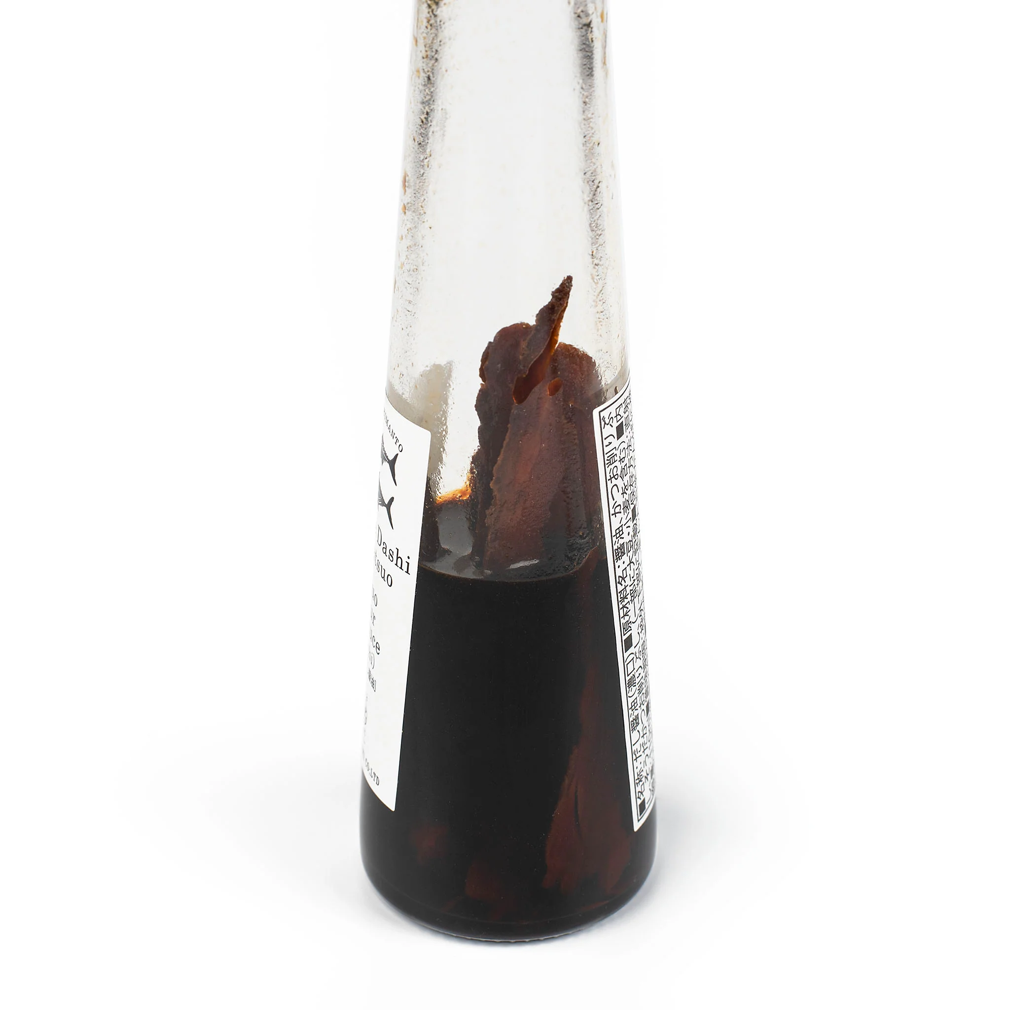 Shimanto Domeki’s Dashi-Infused Koikuchi Soy Sauce is unique in the way in which large shavings of bonito flakes and koikuchi (full-bodied) soy sauce are sealed in the same bottle, creating an umami-rich, dashi-flavored soy sauce. It’s a simple technique but it’s an effective way to extract umami from the bonito flakes, and you’ll also notice a pleasant dashi aroma as you open the bottle. Made by blending two types of bonito flakes (Soda-gatsuo, harvested in the company’s home of Kochi Prefecture, and regular katsuo), the sauce exhibits a robust and wonderful balance of umami. The soy sauce used in the product is also special. It’s brewed with underground water, running deeper than 50-meters (165-feet), alongside the Shimanto River. Aging for over a year with no additives results in a mild and full-bodied flavor. Once finishing half of the dashi-infused soy sauce, feel free to top up the bottle with your choice of soy sauce because the bonito flakes in the bottle still have more umami to give. It can ultimately yield about 2 liters (4 pints) of dashi soy sauce. Create your own dashi soy sauce and enjoy it with a variety of dishes.