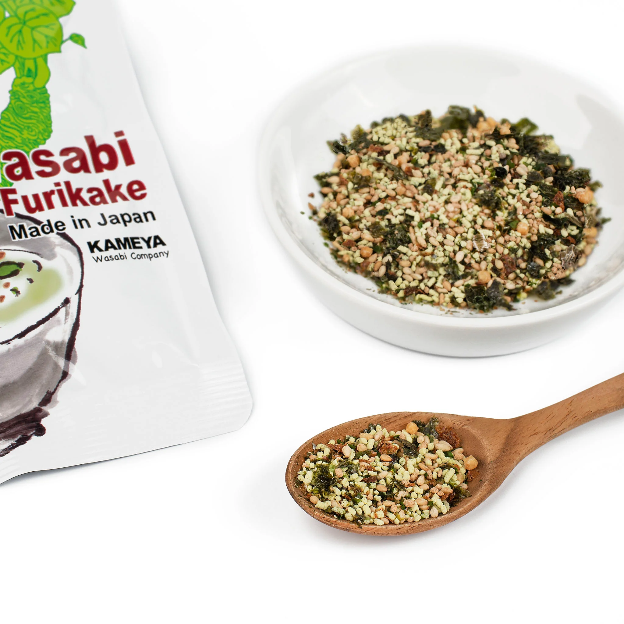 Wasabi Furikake is a savory sprinkle that has been enjoyed in Japan for over 30 years. It features premium “hon wasabi” (literally meaning “real wasabi”) grown in pristine streams in Shizuoka Prefecture, Japan’s top wasabi-producing region. The pungent sensation coming from the wasabi stems creates a perfect harmony with flavorful and aromatic ingredients, including toasted sesame, bonito flakes, nori seaweed, rice crackers, matcha green tea, and soy sauce. The different types of crunchiness of this furikake add an enjoyable accent to a dish. When sprinkled over freshly cooked rice, the steam rising from the rice brings the appetizing aroma straight to your nose. Since the furikake has a substantial kick and multi-layered flavors, it can spice up dishes like noodles, fried rice, donburi rice bowls, or edamame. You can use it for Western dishes like pasta, avocado toast, and popcorn as well.